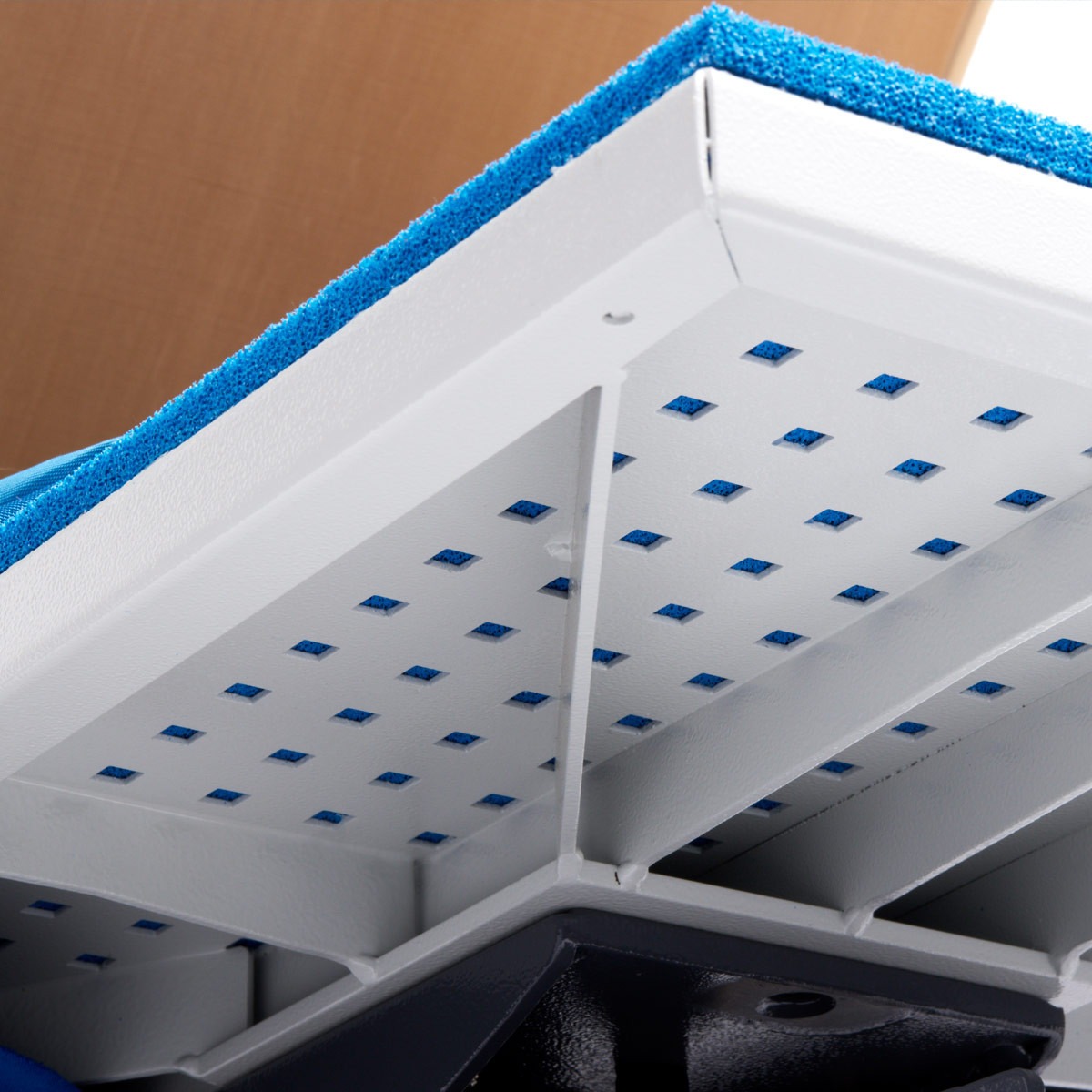 A SCHULZE BLUEPRESS DTG oferece uma base perfurada e um tapete de borracha especial para permitir a máxima libertação de humidade e vapor das roupas impressas por DTG/DTF.
