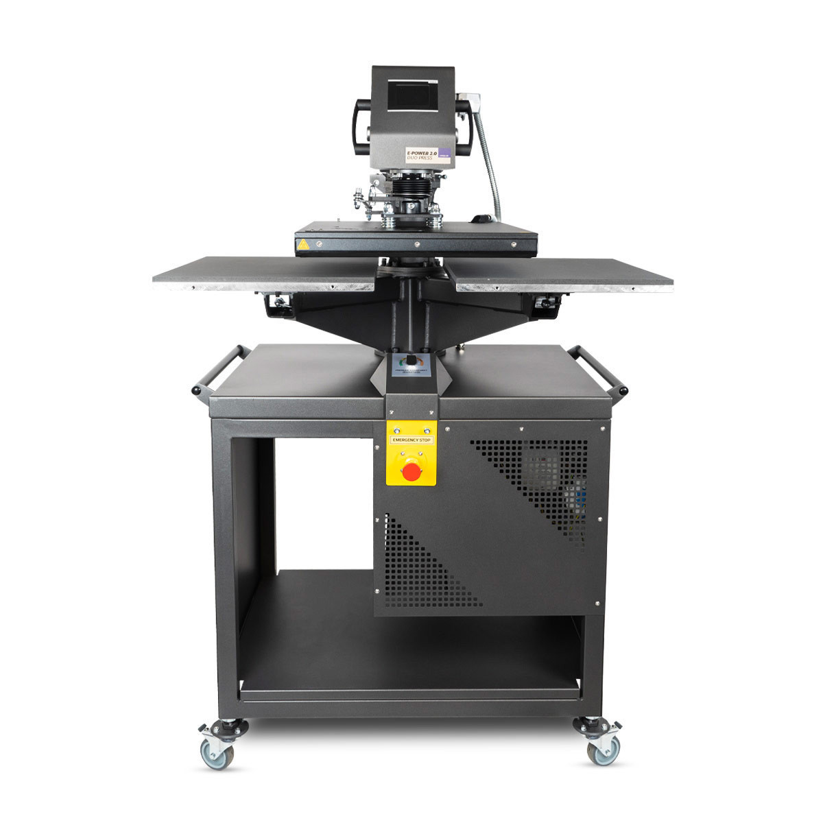 A prensa térmica automática E-Power 2.0 Duo Press abre e fecha automaticamente. Ele é equipado com um modo totalmente automático no qual a placa de aquecimento alterna de uma placa de base para a outra após um tempo livremente selecionável e então realiza o processo de prensagem.