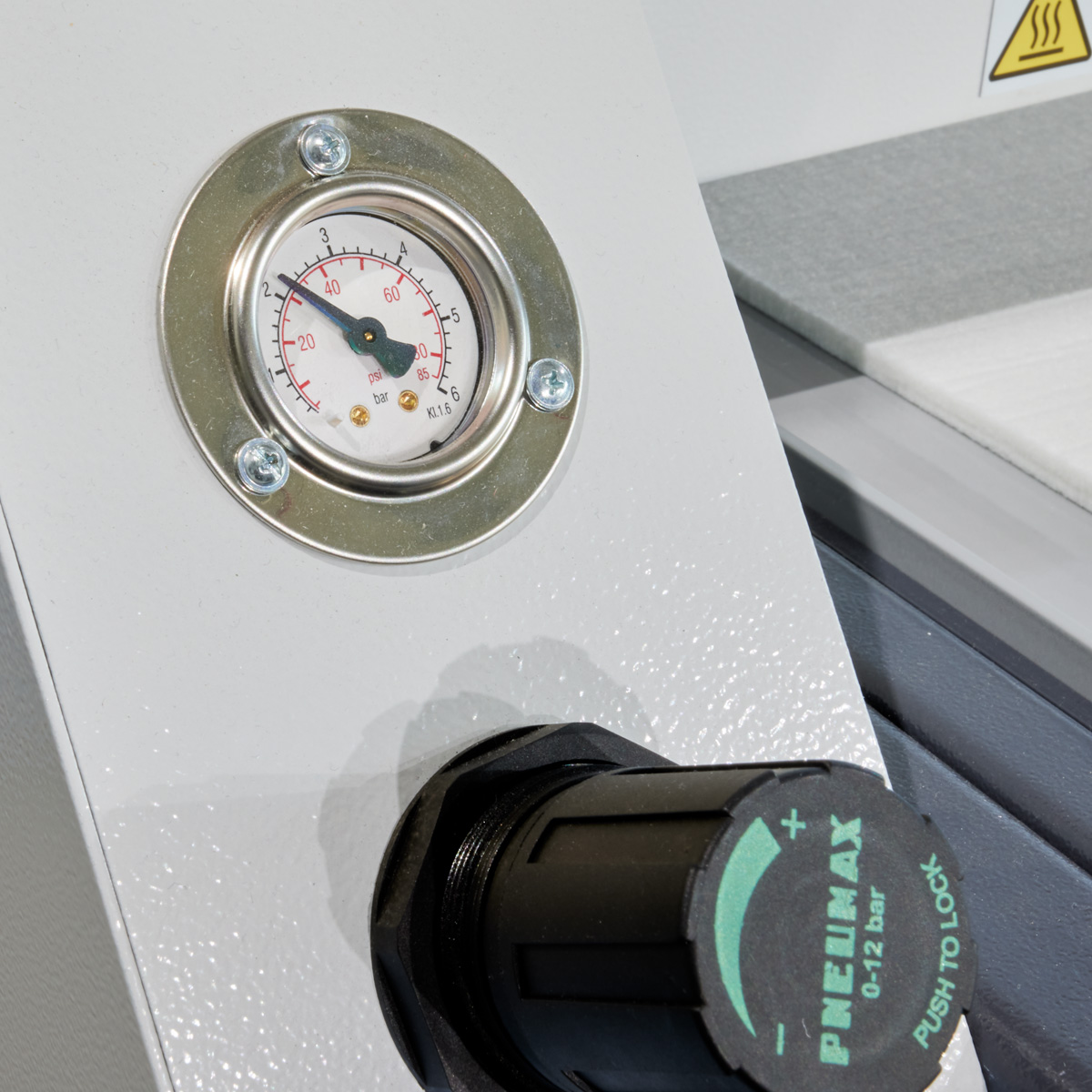 Os vapores resultantes da prensagem são removidos através do dispositivo de extração. Para garantir um trabalho com economia de energia, a placa de aquecimento tem isolamento duplo. Até 136L de ar são consumidos por processo de prensagem.