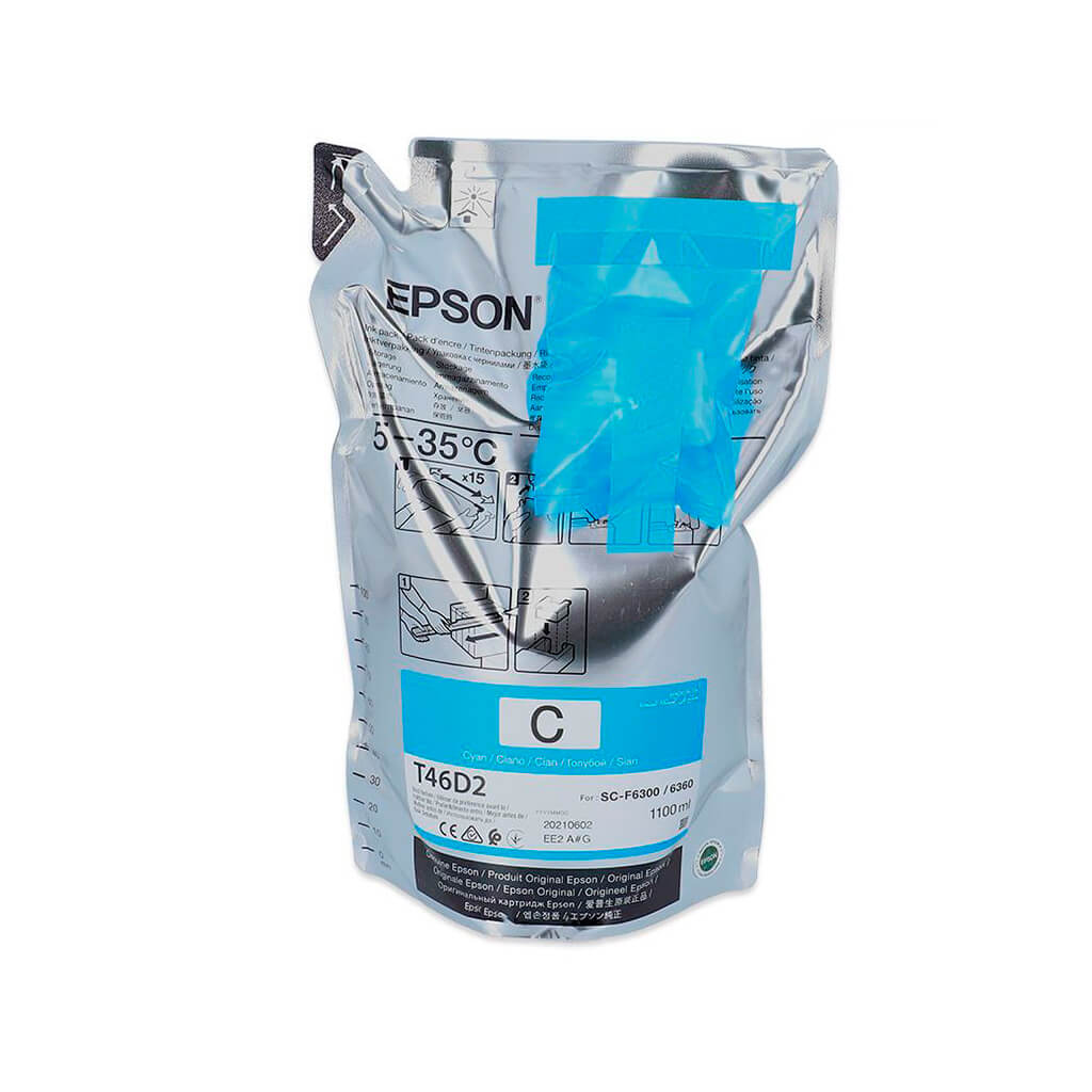 Bolsas de 1100 ml de tinta Epson Ultrachrome DS, desenvolvidas pela Epson para a impressora de sublimação Epson SureColor SC-F6300.